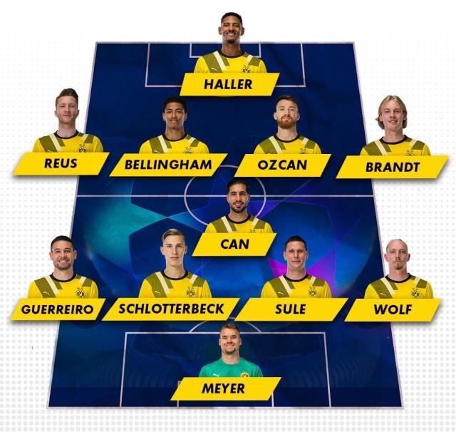 多特蒙德阵容(4141):亚历山大·迈尔/沃尔夫、聚勒、施洛特贝克、格雷罗/埃姆雷·詹/布兰特(5’乔瓦尼·雷纳)、贝林厄姆、厄兹詹(64’拜诺-吉滕斯)、罗伊斯/阿莱(77’马伦)
